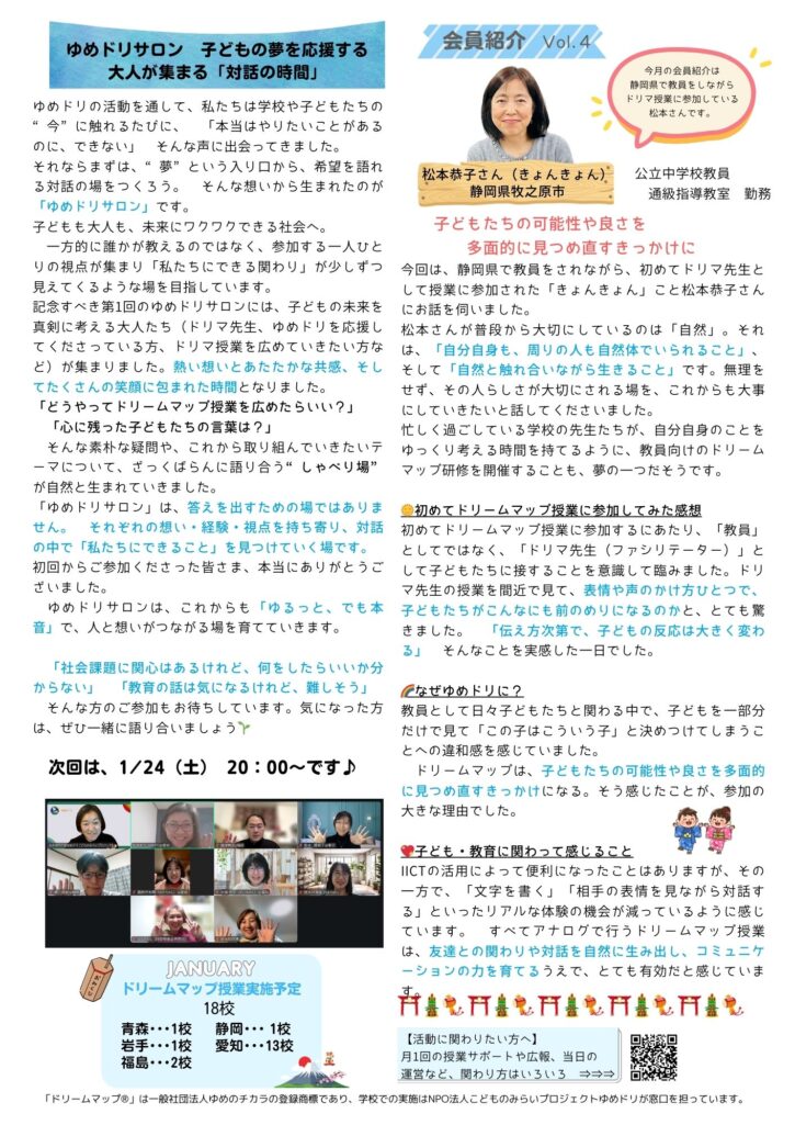 今月号では、春日井市の中学校での授業に初参加したドリマ先生のレポートや、会員紹介(Vol.4)、そして1月の授業実施予定(全国18校)など、現場の声と活動の近況をお届けしています。